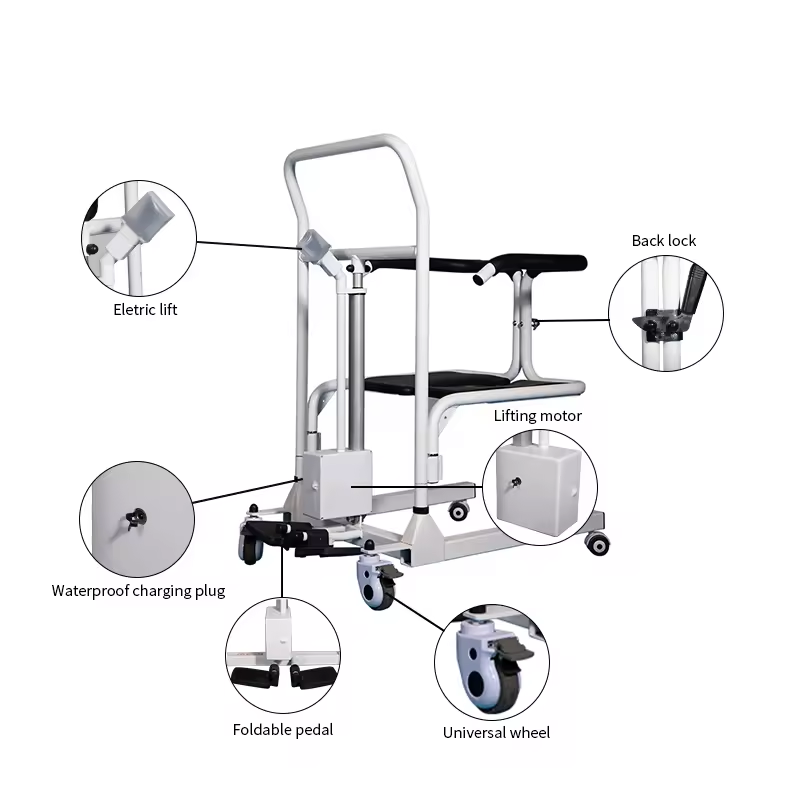 يوفر كرسي نقل المصعد الكهربائي طريقة مريحة وآمنة لنقل المرضى. يمكن لمقدمي الرعاية نقل المرضى بسهولة إلى الأسرة والحمامات والمراحيض والمواقع الأخرى. مزيج من الأسود والأبيض جميل وأنيق. يعتمد الجسم الرئيسي بنية فولاذية عالية القوة ، وهو متين ودائم ويمكنه تحمل حمولة 135 كجم. لا يمكن استخدامه فقط ككرسي رفع النقل ، ولكن أيضًا ككراسي متحركة ، كرسي مرحاض ، كرسي دش. هذا هو الخيار الأول لمقدمي الرعاية وعائلاتهم.